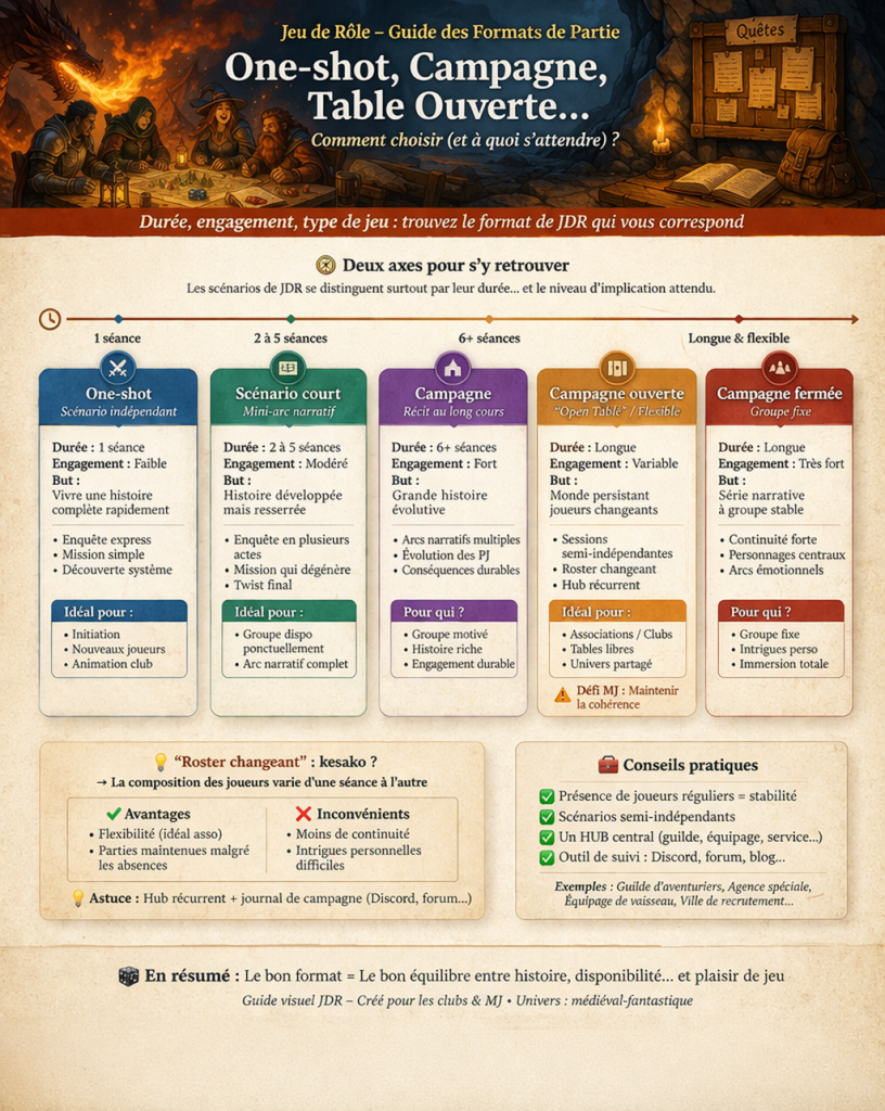 Sujet plus sensible qu’il n’y paraît, la classification des types de scénarios en jeu de rôle — one-shot, campagne ouverte ou fermée, mini-campagne — suscite régulièrement débats et interprétations. Une question qui devient d’autant plus concrète lorsque le jeu de rôle se pratique en club, avec ses contraintes d’organisation et d’assiduité.